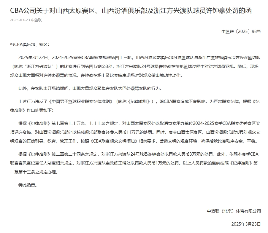 金年会4月18日讯 此前,CBA官方宣布了对此前晋粤大战双方违规行为的罚单,其中,山西赛区和山西俱乐部被严重警告,并核减15万经费。